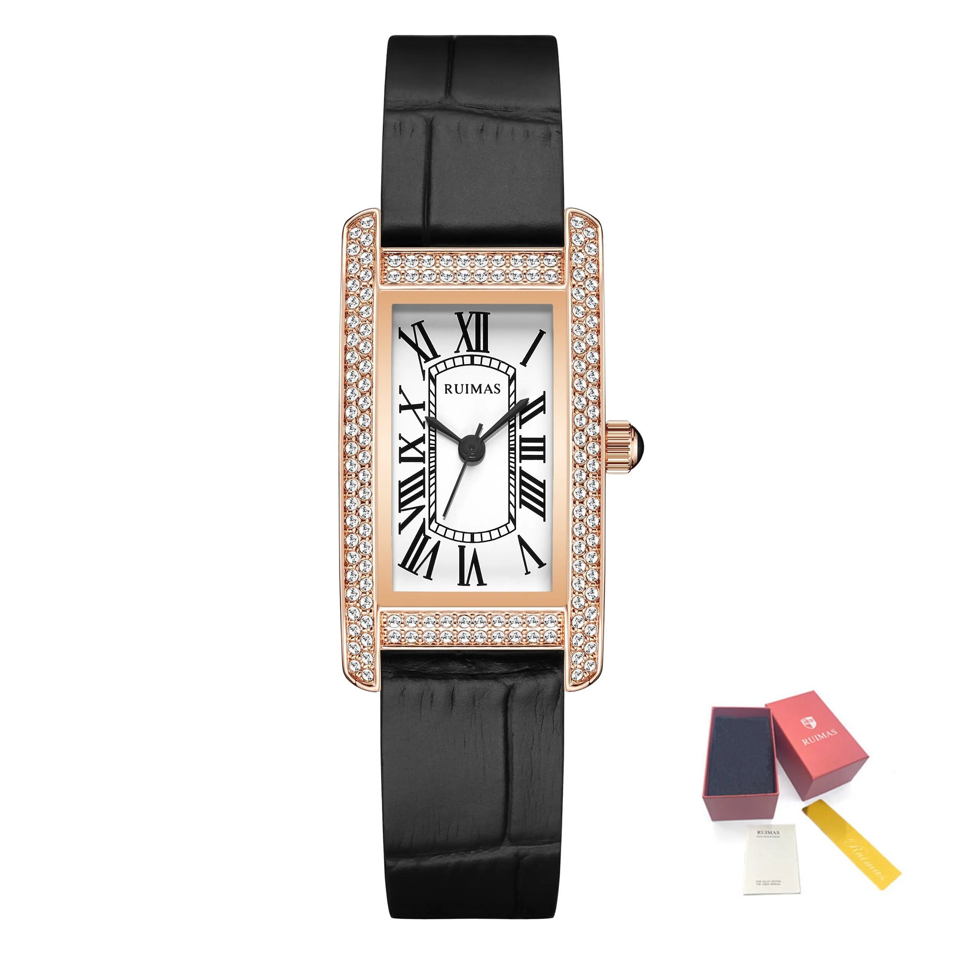 Montre-bracelet de luxe à quartz carrée pour femme RUIMAS, en cuir or rose.