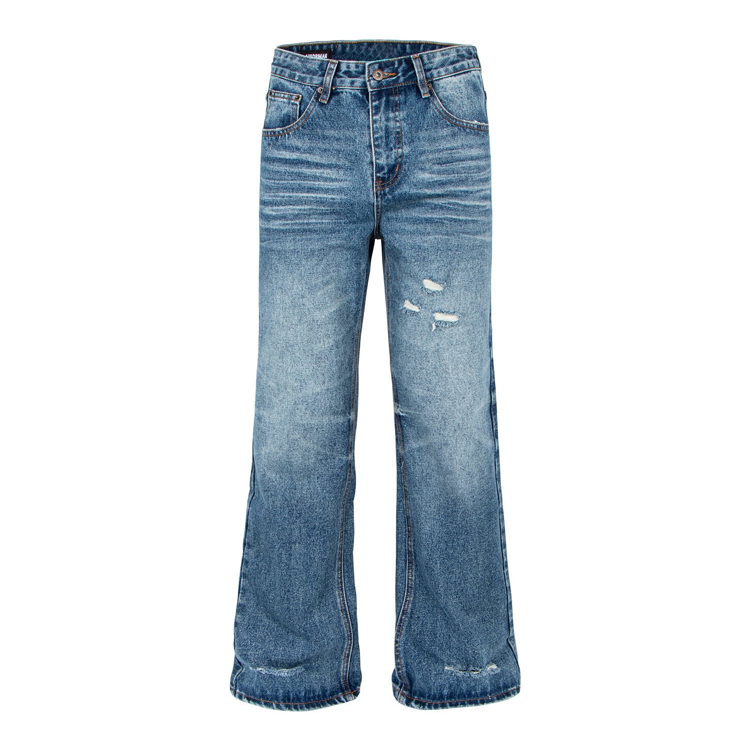 Blue Distressed Cat-Whisker Bamboo Texture Flared Jeans