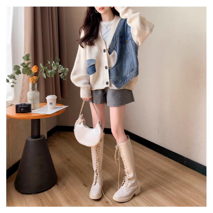 Designer-style Short Knit Denim Patchwork Cardigan for Women
