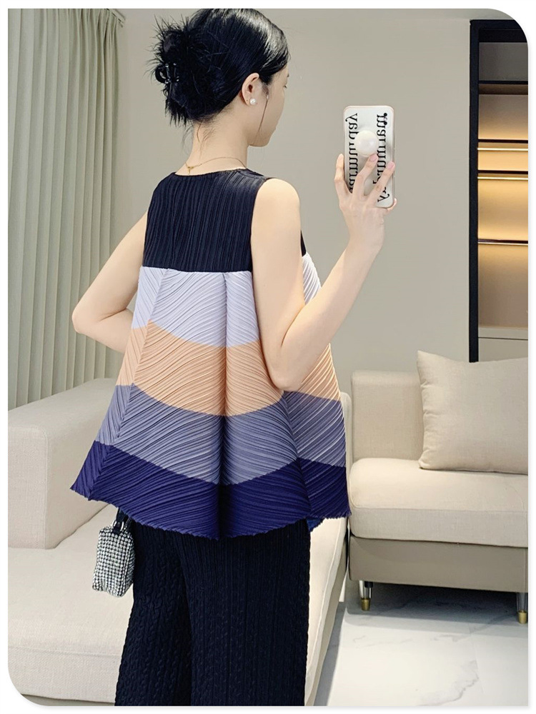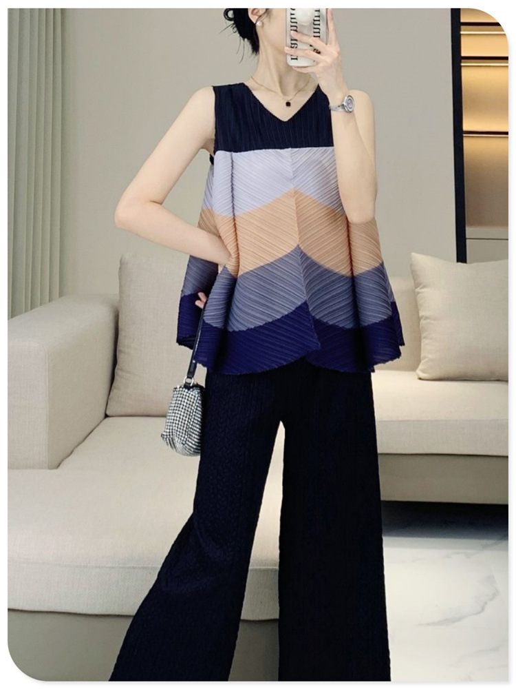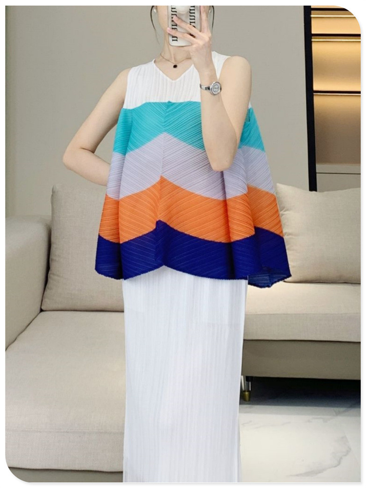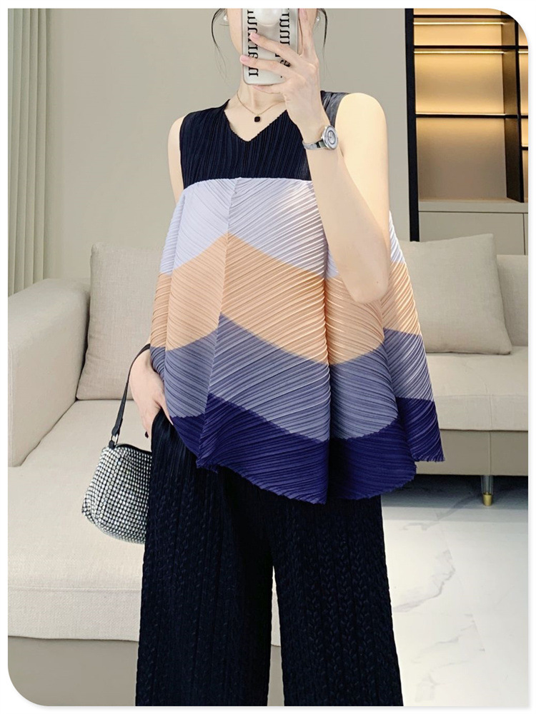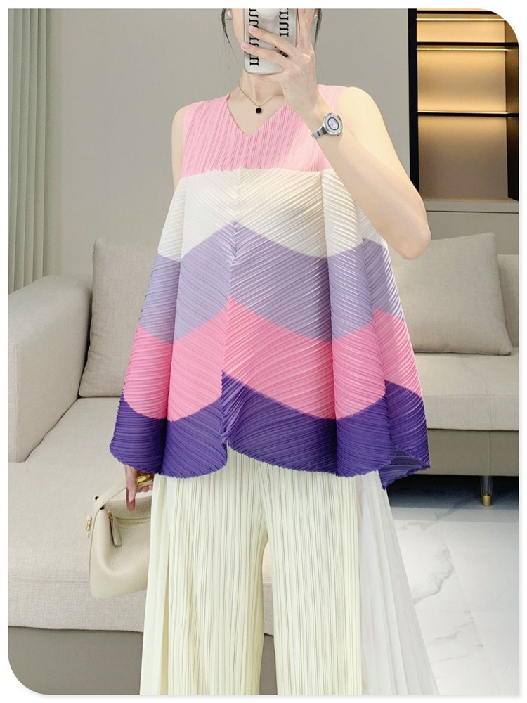 V-Neck Color Blocked Sleeveless Top This contemporary sleeveless top combines a flattering V-neck with strategic color blocking for modern visual interest. The loose, pleated silhouette offers a relaxed fit that works for multiple body types and styling preferences. Crafted for youthful, fashion-forward aesthetics, it transitions seamlessly from casual outings to layered looks. The versatile design pairs effortlessly with jeans, skirts, or trousers. Shop with confidence—we stand behind every purchase with a 7-day unconditional return policy, ensuring complete satisfaction with your selection.